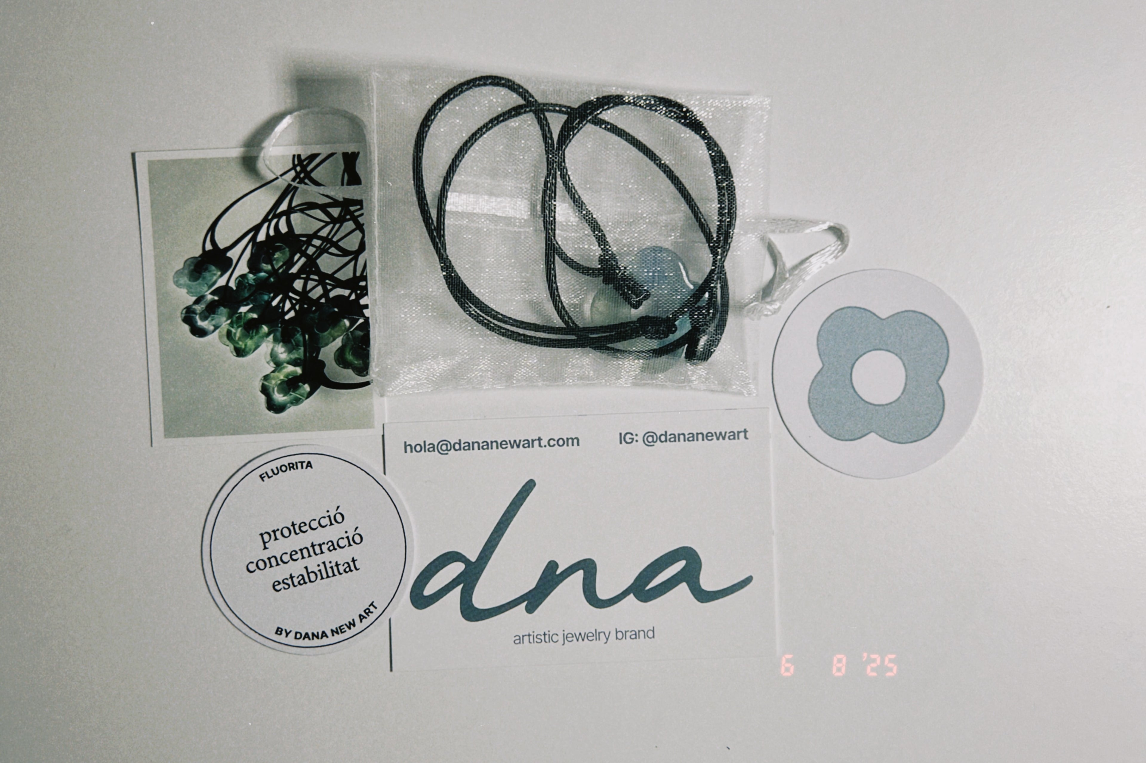 La esencia de Dana New Art se centra en la experiencia de recibir tu joya. No solo recibes tu collar, sino también cuatro tarjetas únicas: una con las propiedades de tu piedra, una con un dibujo de la misma, una ilustrada a mano y una que te explica cómo cargar y proteger tu piedra. Todo llega cuidadosamente presentado dentro de su bolsita y en una cajita, cuidando cada detalle para que recibir tu joya sea un momento especial.